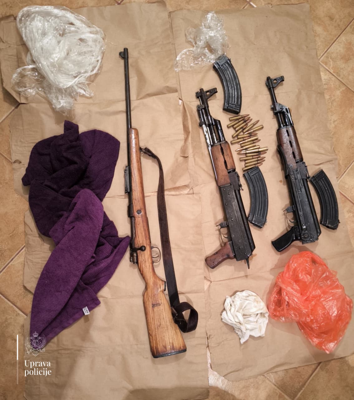Tokom jučerašnjeg pretresa u porodičnoj kući u mjestu Komani pronađene su tri puške, od čega dvije automatske, 20 metaka nepoznatog kalibra i tri okvira za pušku, te u stanu osumnjičenog kutija za pištolj sa dva okvira i lisice